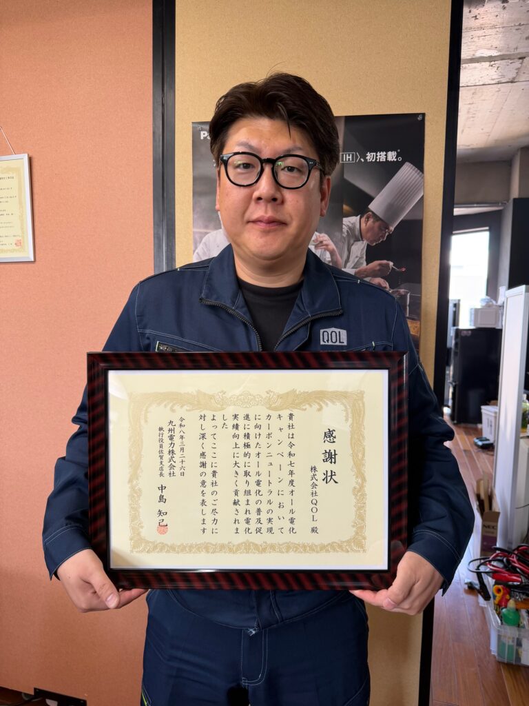 嬉しいニュースのご報告です! この度、カーボンニュートラルの実現に向けたオール電化の普及促進について、年間を通じた好成績が評価され、九州電力(株)様より感謝状を授与されました。